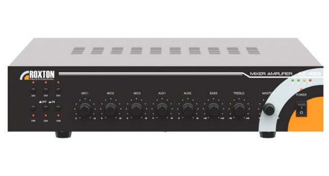 Микшер-усилитель позволяет суммировать сигналы, поступающие на 1 микрофонный и 2 универсальных входа одновременно. Громкость меняется соответствующими регуляторами, расположенными на передней панели. Здесь же расположены два регулятора тембра НЧ и ВЧ, общий регулятор уровня сигнала MASTER, кнопка включения питания. Микрофонный вход MIC 1 INPUT предназначен для подключения динамического микрофона и является приоритетным. Поданный на этот вход сигнал автоматически приглушает сигналы от остальных входов, кроме входа АТС. Степень приглушения устанавливается регулятором MIC 1 DUCKING DEPTH. Применение балансной схемы входных каскадов обеспечивает эффективное подавление синфазных помех, которые возникают даже в экранированном кабеле. Первый универсальный вход MIC2/AUX состоит из комбинации микрофонного входа MIC 2 INPUT и линейного входа STEREO AUX INPUT, имеющего гнездо с разъемом типа mini-jack диаметром 3,5 мм. Также имеется возможность подключения источников линейного сигнала при помощи трехконтактной клеммы. Переключатель SELECT позволяет выбрать вход подключения. Второй универсальный вход MIC3/CD/SATELLITE в свою очередь состоит из комбинации микрофонного входа MIC 3 INPUT и линейного входа CD/SATELLITE INPUT с разъемом типа RCA, предназначенного для подключения CD-проигрывателей, спутниковых и эфирных приемников. Выбор входа осуществляется переключателем SELECT. Вход для подключения АТС имеет наивысший приоритет. При появлении сигнала на нем, сигналы от всех остальных входов будут автоматически приглушаться. Степень приглушения определяется регулятором TEL INPUT DUCKING DEPTH. Уровень выходного сигнала от АТС можно настроить при помощи регулятора TEL INPUT GAIN. В PA-935N предусмотрено несколько вариантов подключения громкоговорителей. При подключении акустических систем возможен выбор выходного напряжения на трансляционной линии - 100 В или 70 В. Возможно также подключение к усилителю громкоговорителя сопротивлением 4 Ом и 8 Ом. Металлический корпус устройства создает надежный экран для защиты от воздействия электромагнитных помех, что позволяет ему работать с малыми уровнями сигналов. Сам корпус покрыт порошковой краской черного цвета. С помощью дополнительных кронштейнов BKT-PA935A усилитель может устанавливаться в стойку 19'. Питается микшер-усилитель от сети переменного напряжения 220 В 50 Гц.